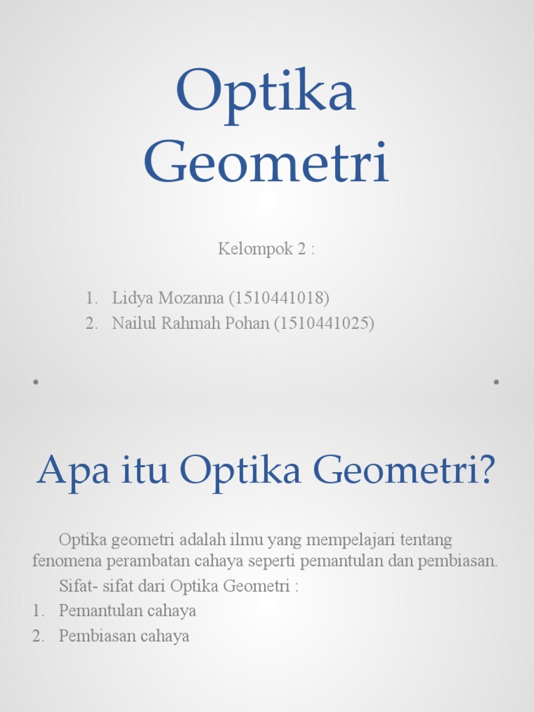 Optik geometri adalah cabang ilmu fisika yang mempelajari sifat-sifat cahaya dan bagaimana cahaya bergerak, terpantul, serta dibiaskan. Dengan pemahaman tentang prinsip-prinsip dasar seperti hukum pemantulan dan pembiasan, kita dapat memahami bagaimana perangkat optik seperti kamera, mikroskop, dan teleskop bekerja. Selain itu, optik geometri memiliki banyak aplikasi dalam kehidupan sehari-hari, baik dalam bidang teknologi, medis, atau seni.