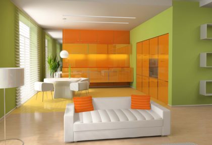 Dinding hijau botol dengan lantai putih akan menciptakan kesan bersih dan segar. Cocok untuk ruang tamu atau kamar tidur.