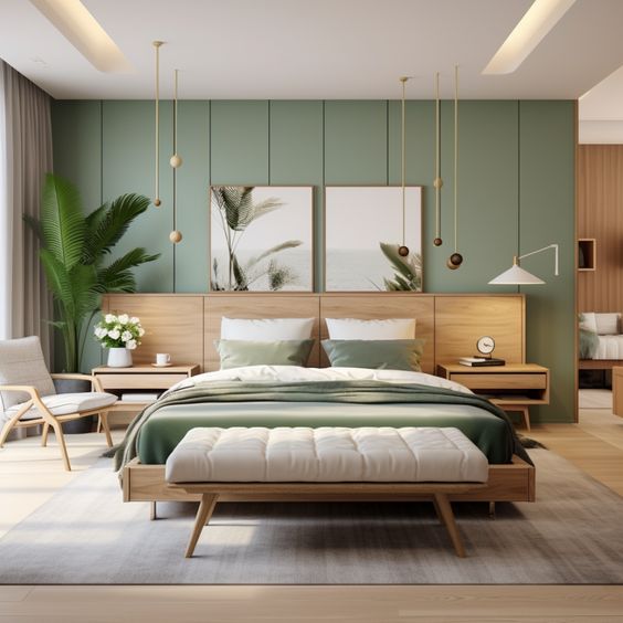 Gunakan warna hijau botol untuk dinding atau furnitur utama, lalu tambahkan aksen dari kayu alami atau bahan-bahan alami lainnya. Kombinasi ini menciptakan ruang yang tenang dan alami. -